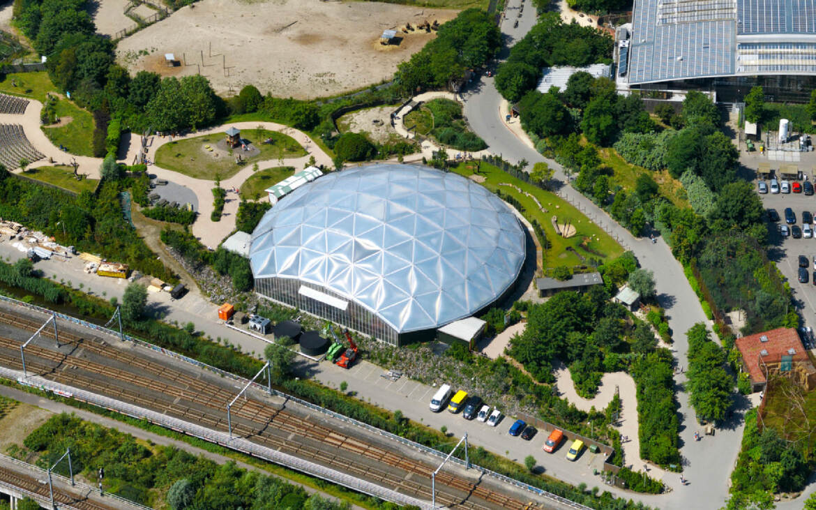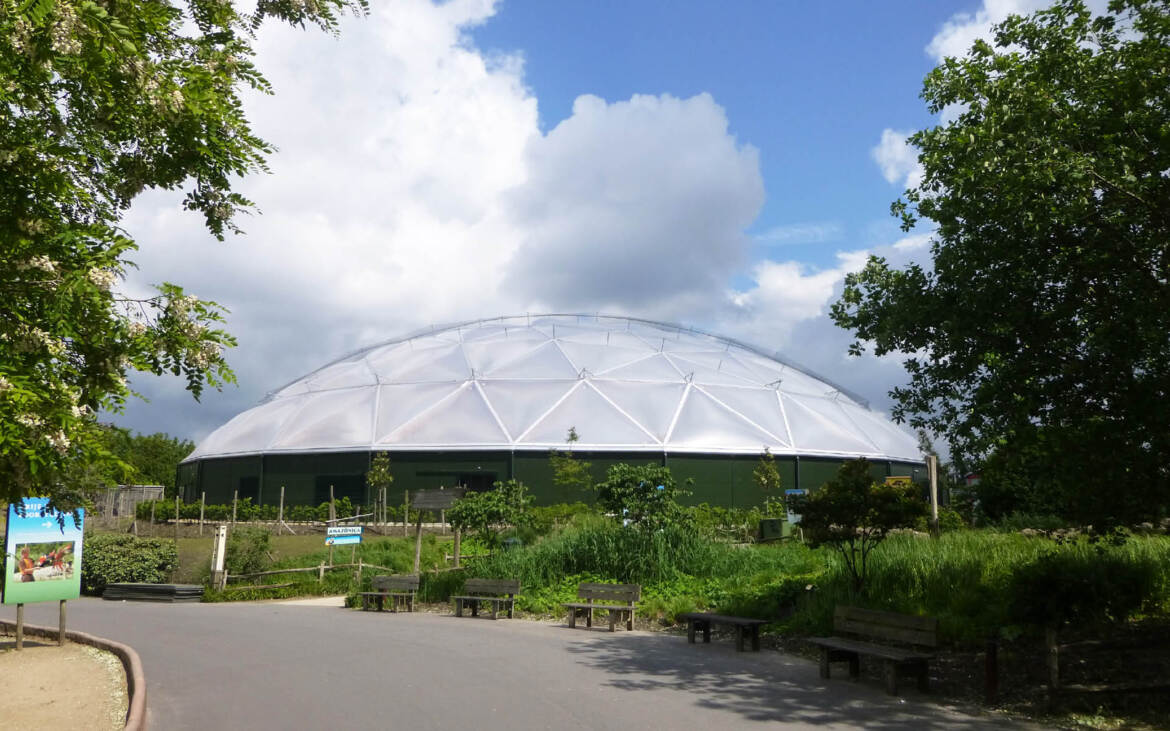 Amazonica is a new attraction in a new South-America themed zone of Rotterdam Zoo. The structure enclose a complete biotope of flora and fauna: a tropical rain forest with a river, reptiles, turtles and butterflies. The roof is built as a timber-framed geodesic dome with an infill of transparent, air-filled dual layer foil.