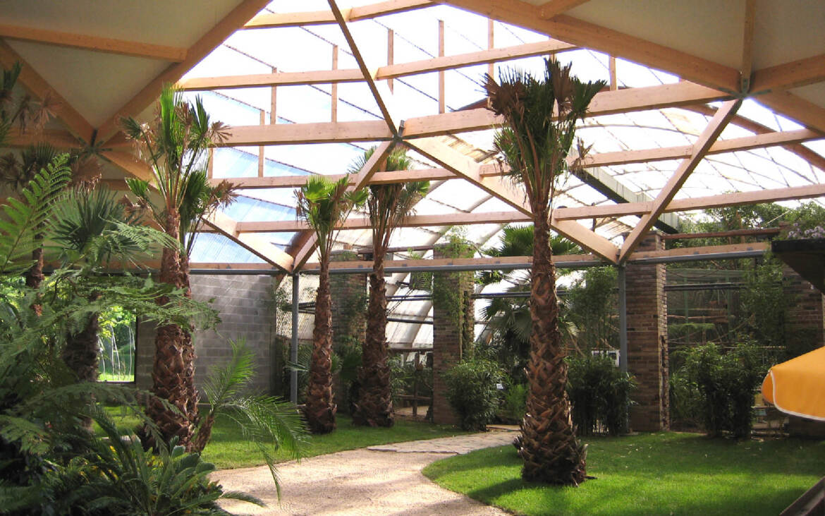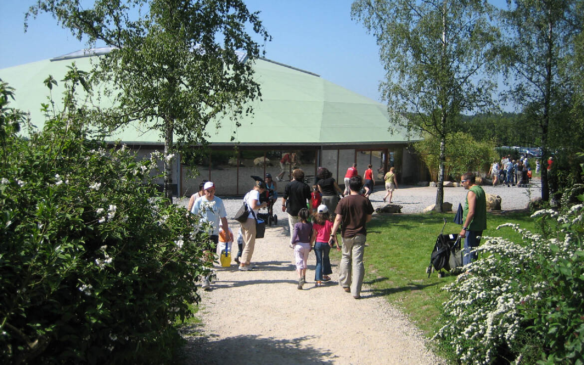 Arc2 architects designed an attractive entrance pavilion for the Monde Sauvage Safari Park. The eyecatcher of the whole project is a splendid dome of 40 metres in diameter. A star-shaped transparent section at the middle of the dome provides natural daylighting. Its opaque parts are clad with sandwich panels. The entrance pavilion encloses a refreshment bar with a terrace, a small amphitheatre and different biotopes for tropical plants, reptiles, birds etc.