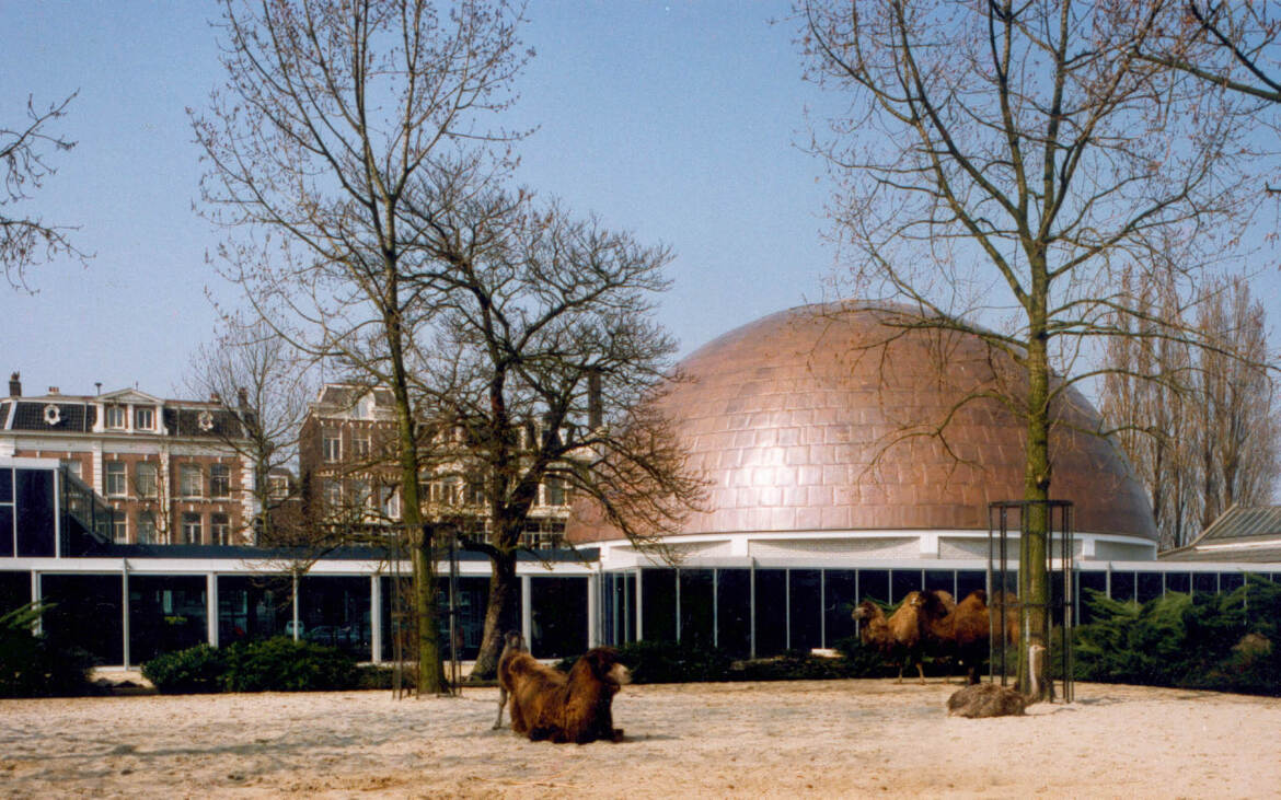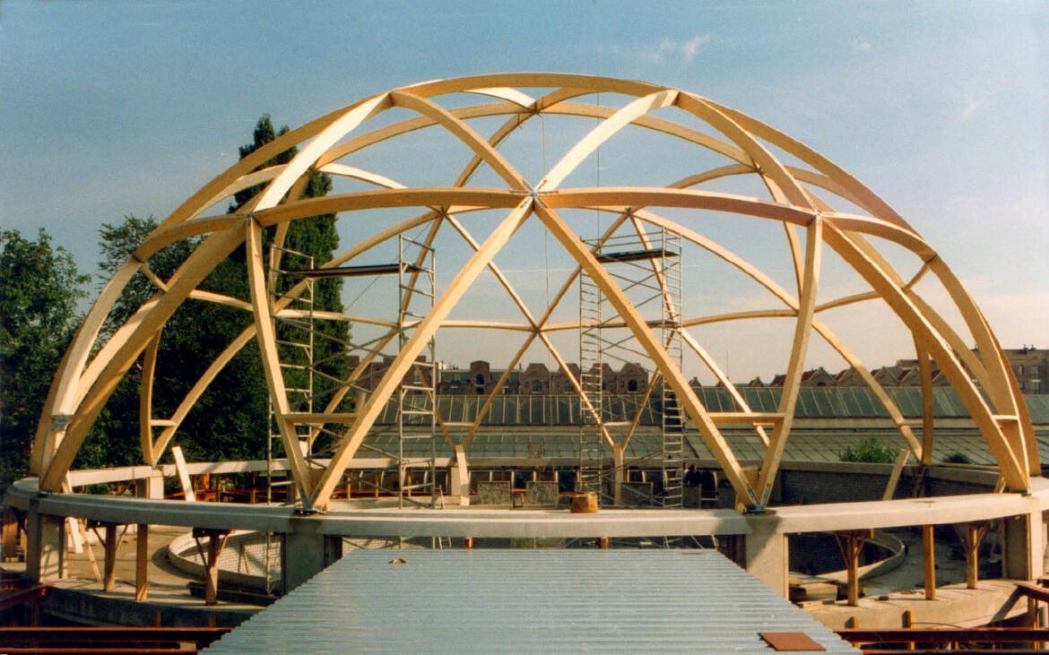 De koepel voor het planetarium van Artis is uitgevoerd in spanten van gelamineerd hout en heeft een diameter van 25 meter. De spanten hebben een kromming en dit maakt het mogelijk om een perfecte bolvorm te creëren. De koepelconstructie is afgetimmerd met latten en de dakbedekking bestaat uit gefelsde koperplaten.